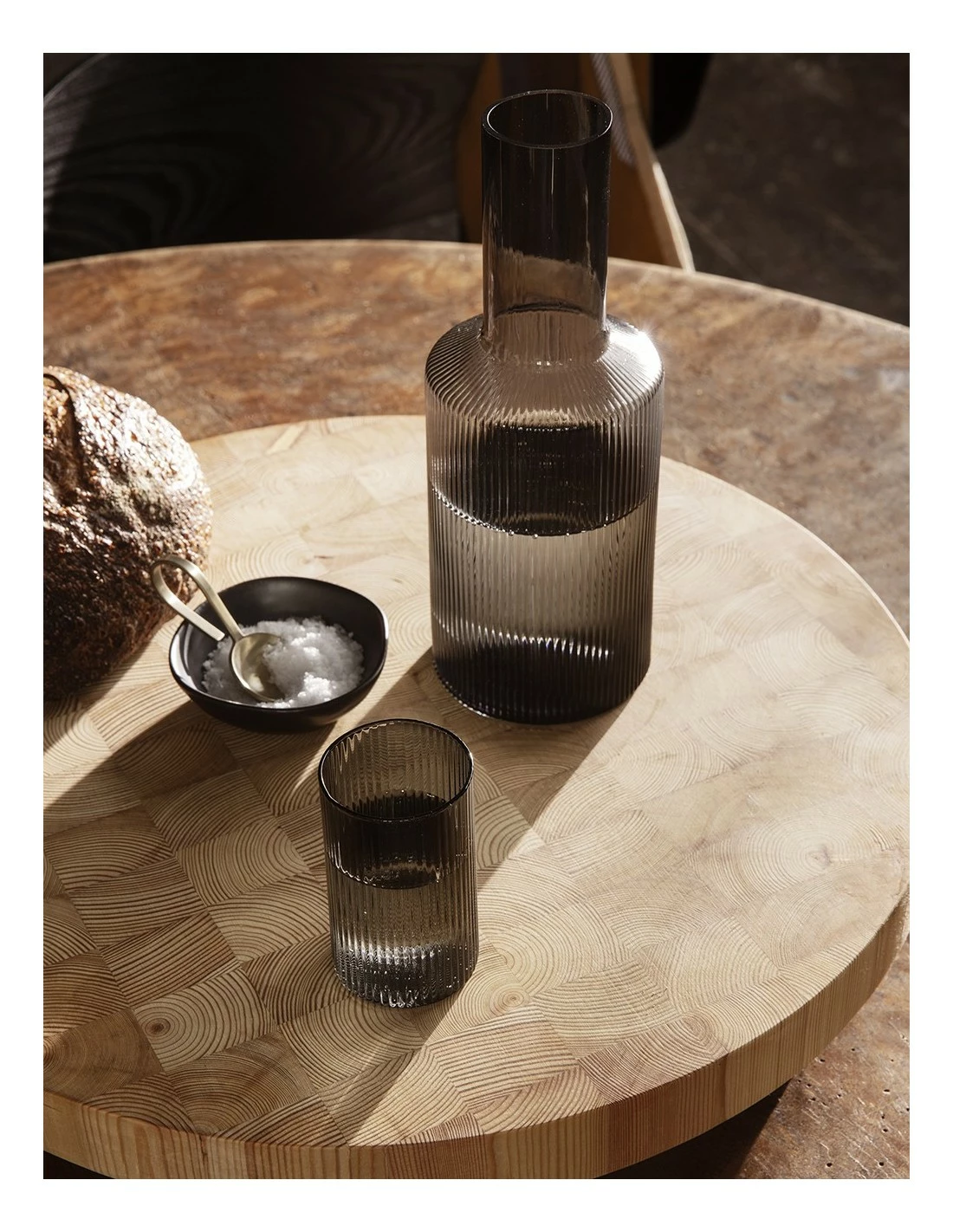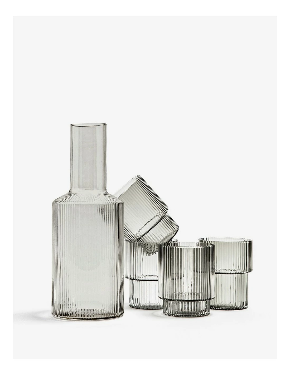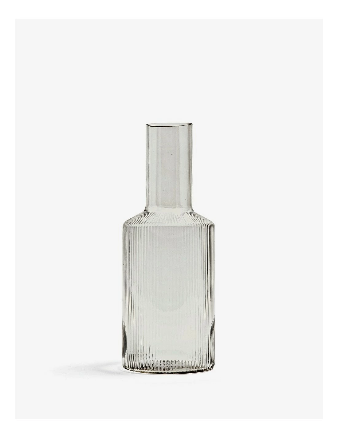 Estilosa jarra soplada en molde con diseño de ondas en la superficie. Capacidad de un litro, apta para lavavajillas.