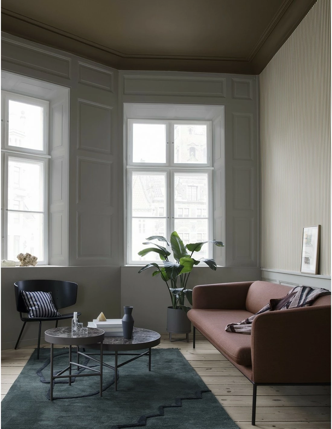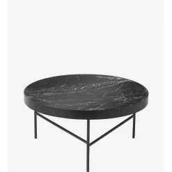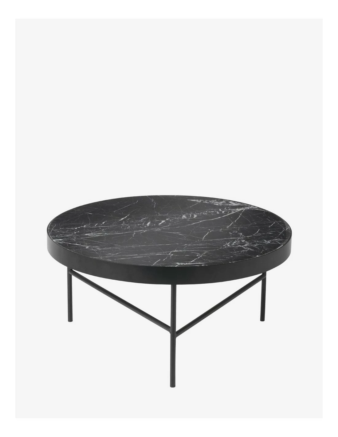 Mesa de mármol y metal de Ferm Living. El diseño minimalista y ligero de la estructura contrasta con una pieza solida de mármol creando dramatismo.