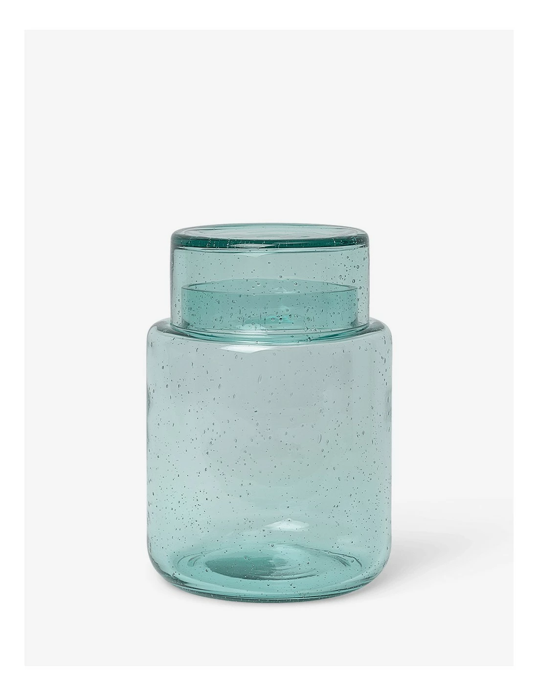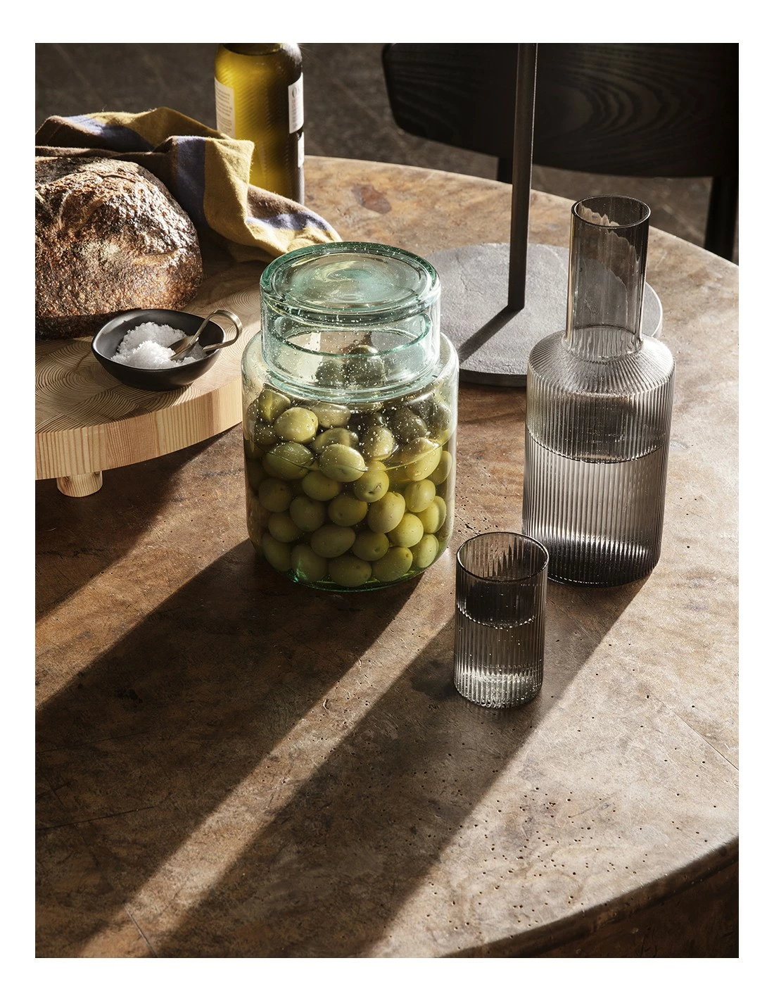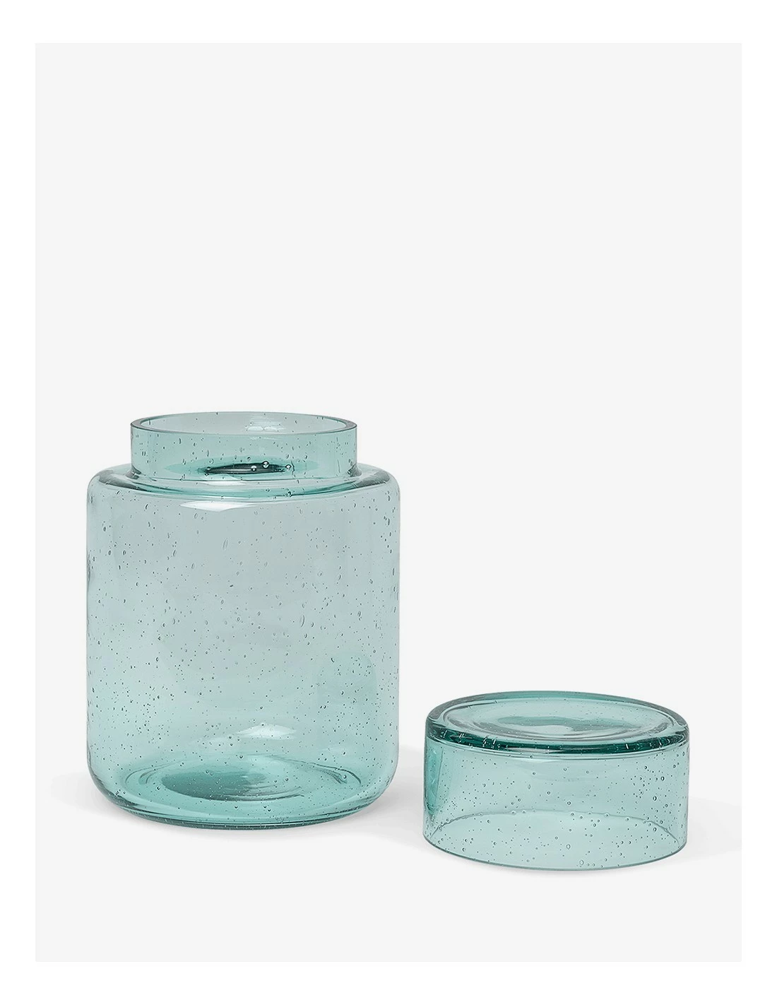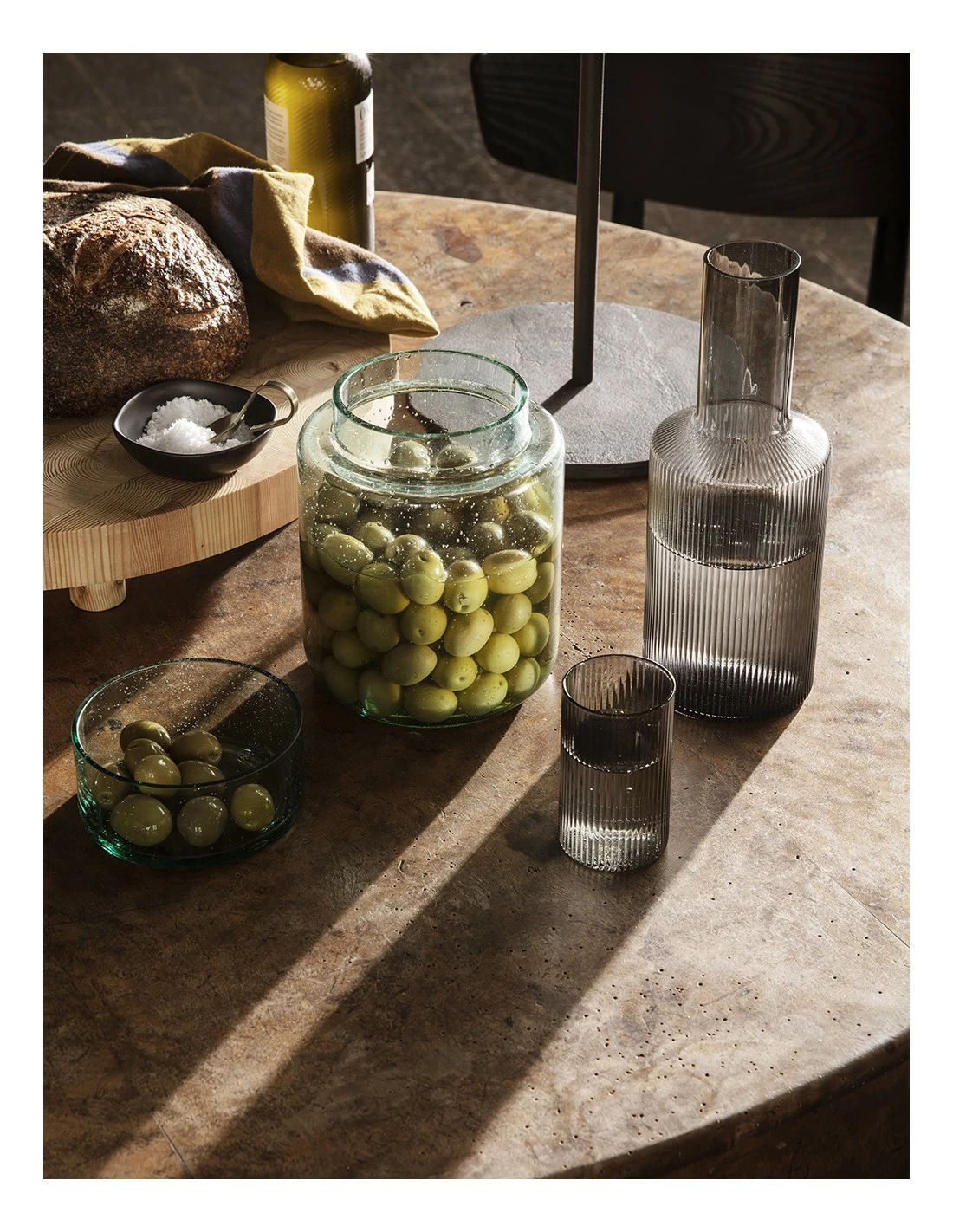 Oli se realiza artesanalmente en vidrio reciclado, utilizando una técnica que deja burbujas entre las diferentes capas, dándole así su aspecto orgánico.
