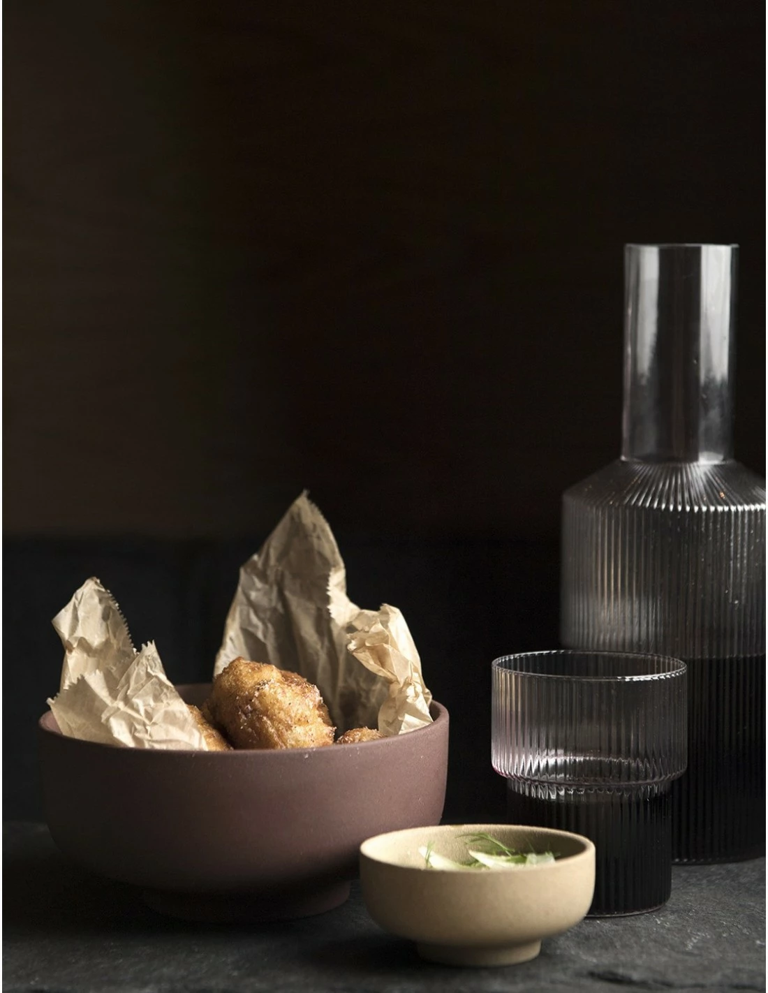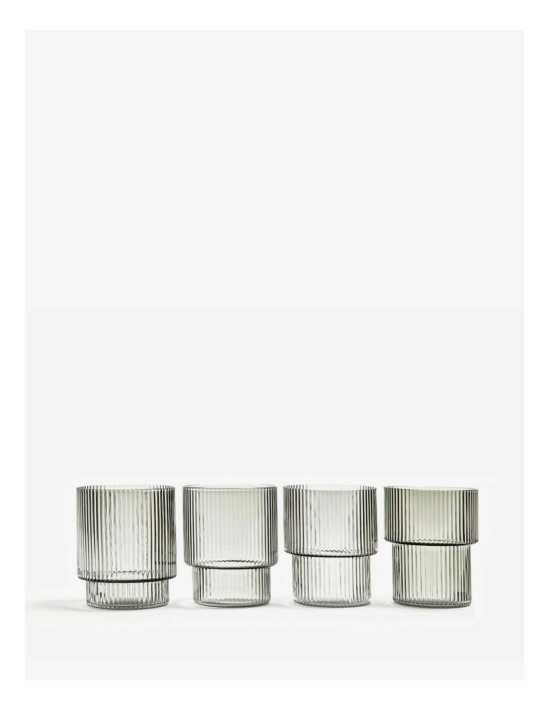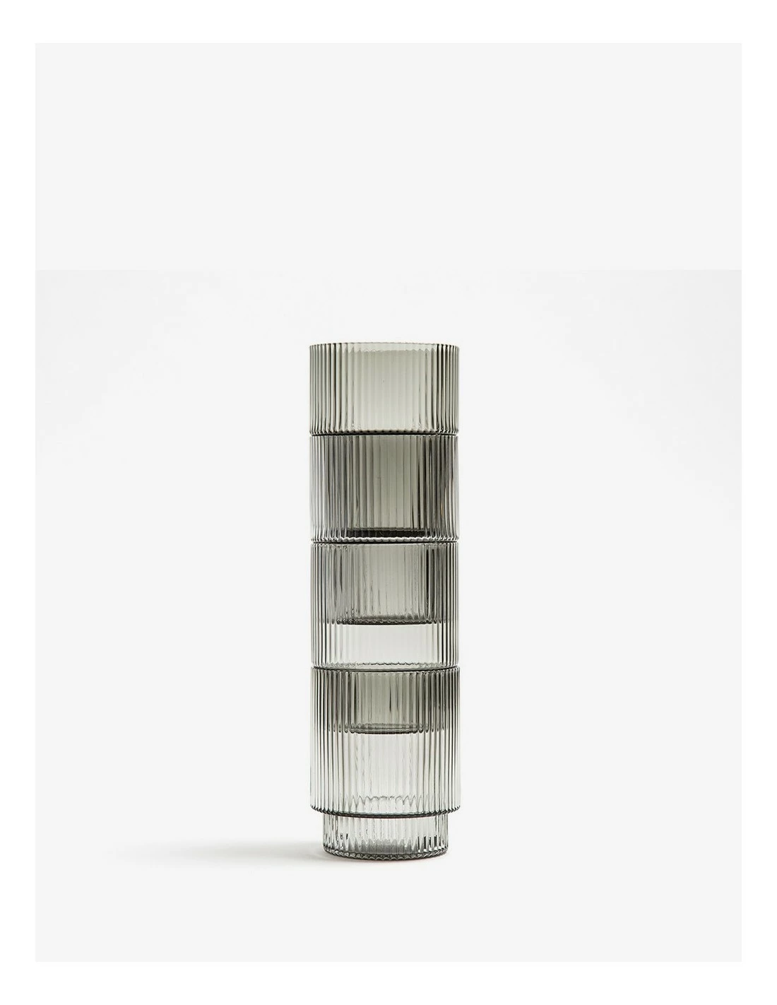 Set de vasos apilables soplados en molde con diseño de ondas en la superficie.