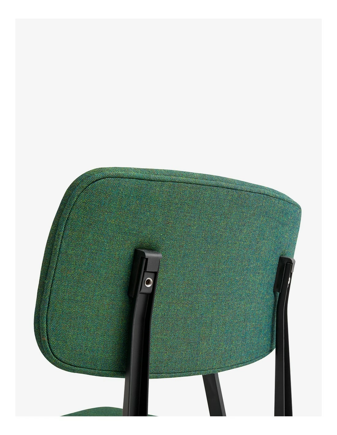 La silla Result con base de chapa de acero con asiento y respaldo de roble, conserva flexibilidad, ligereza y resistencia, manteniendo el diseño minimalista.