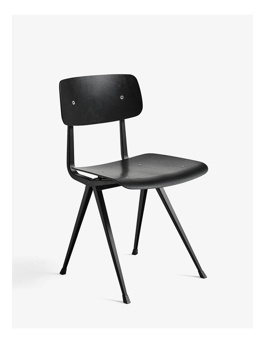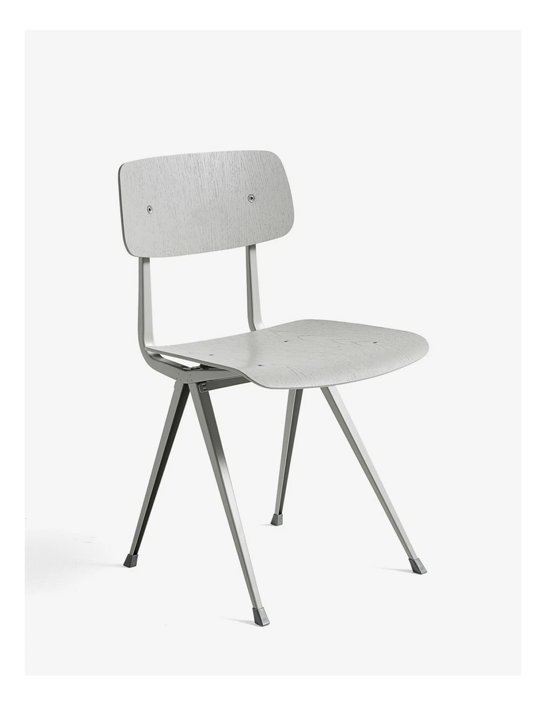 La silla Result con base de chapa de acero con asiento y respaldo de roble, conserva flexibilidad, ligereza y resistencia, manteniendo el diseño minimalista.