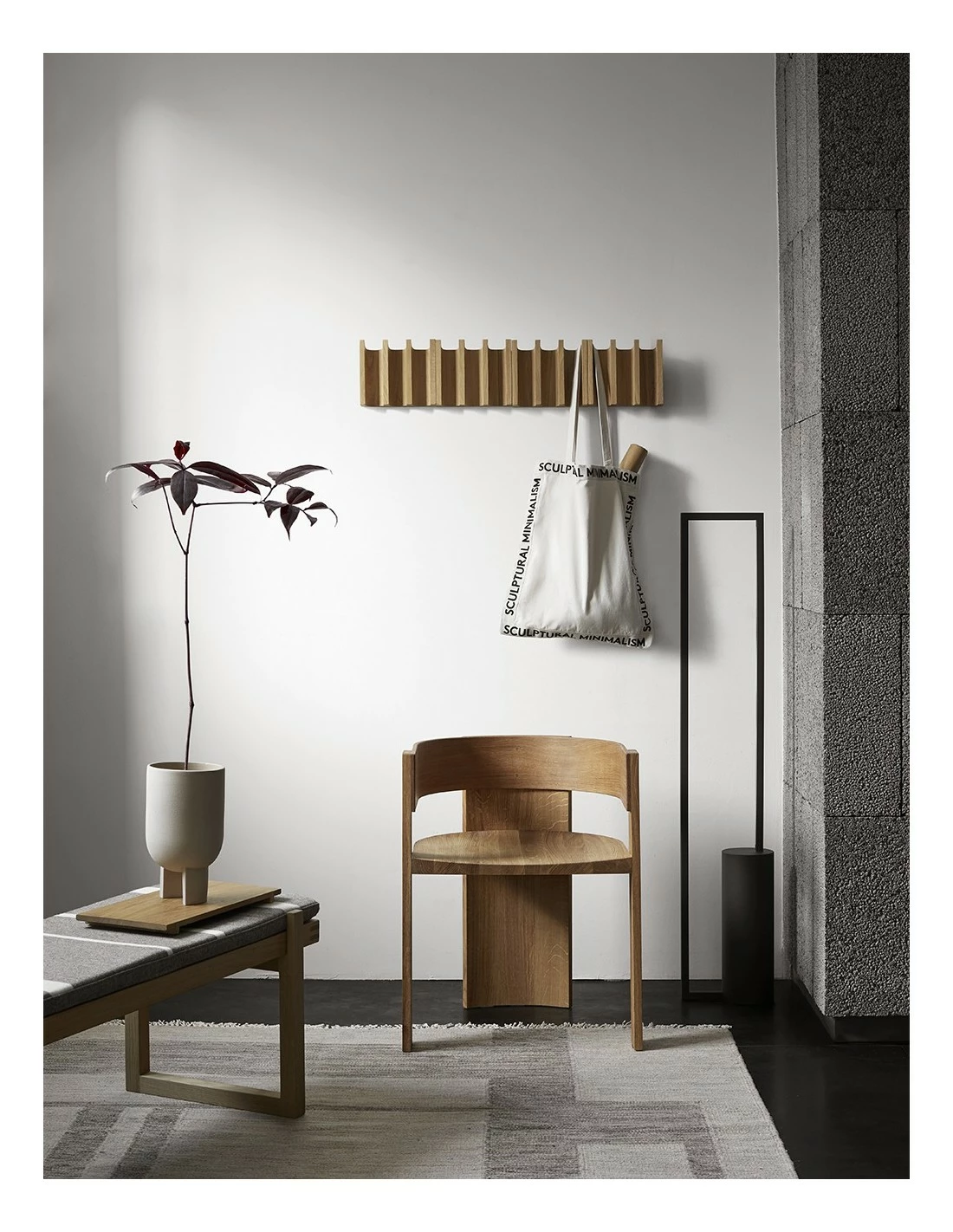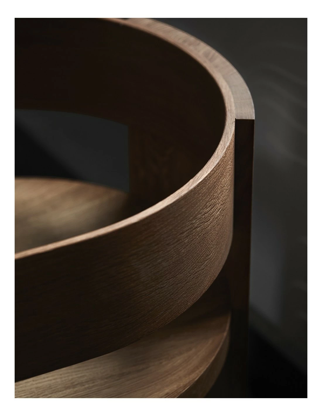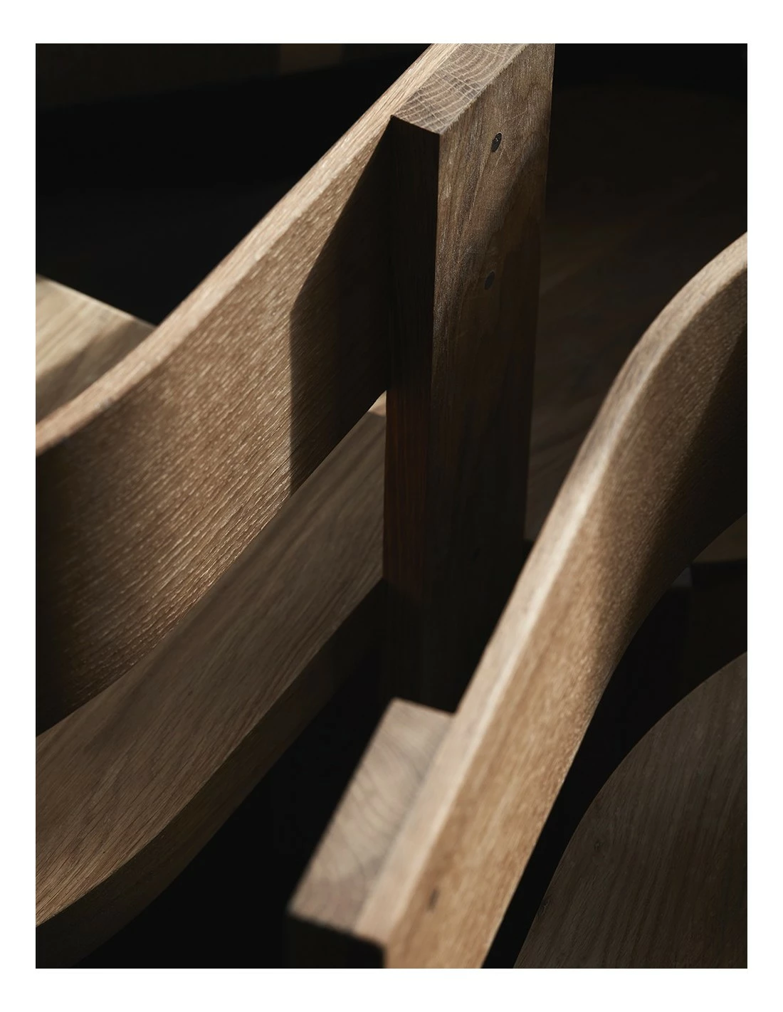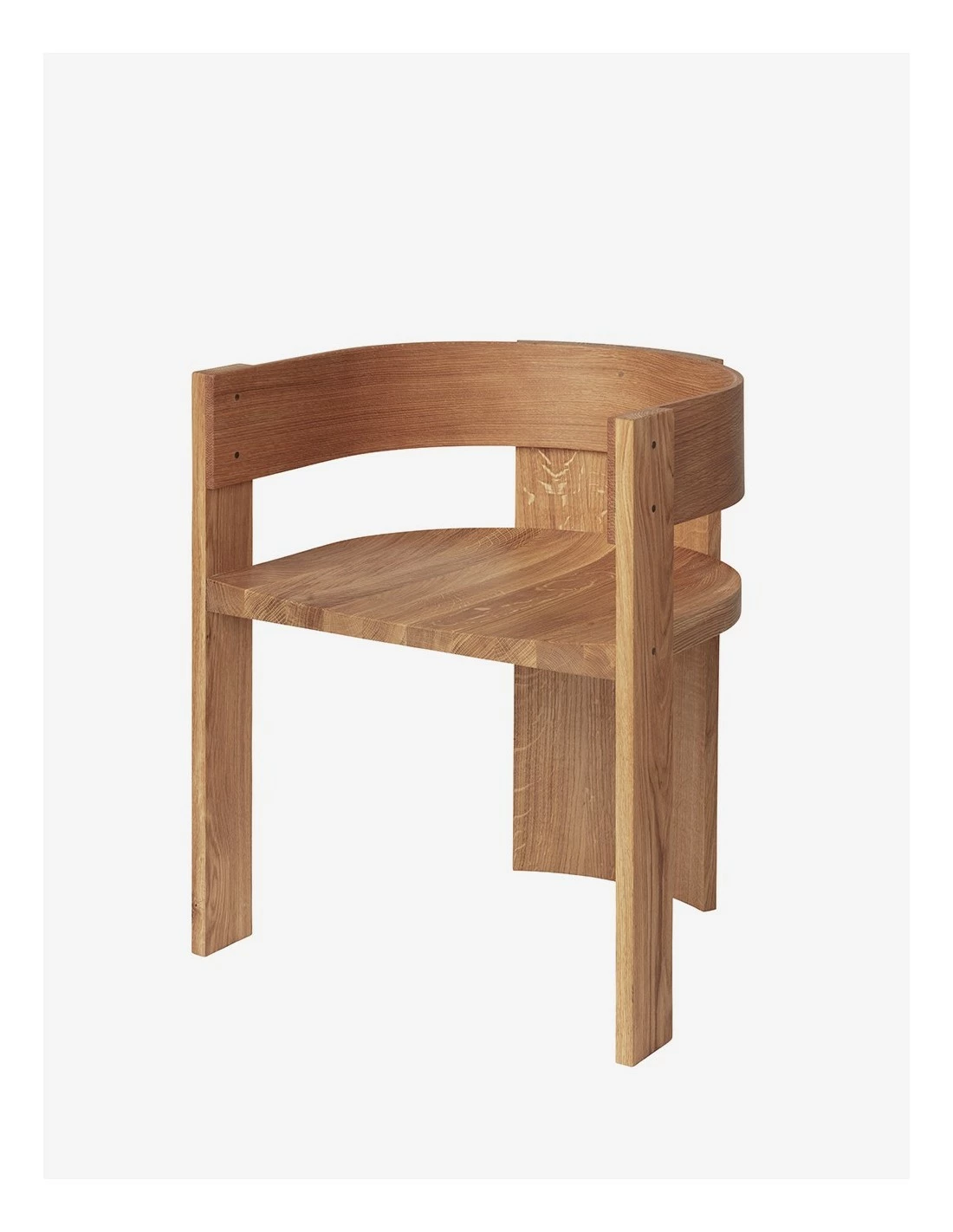 El diseño de Collector Dining Chair está compuesto por un arco del cual surgen tres patas que abrazan asiento y respaldo formando una pieza escultórica.
