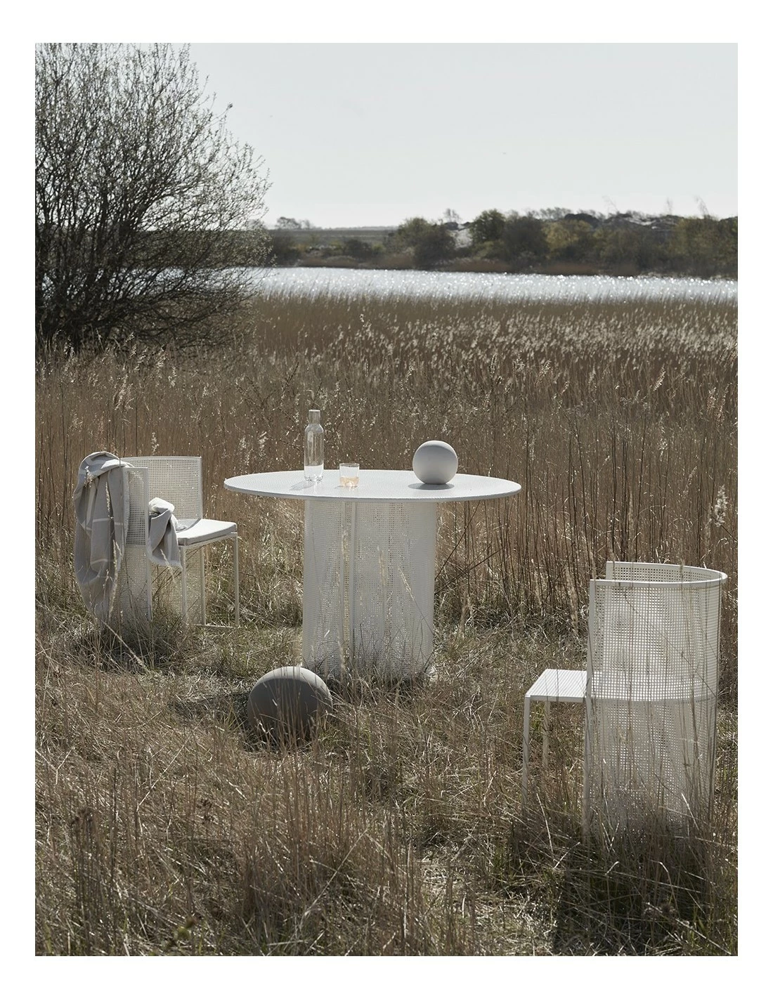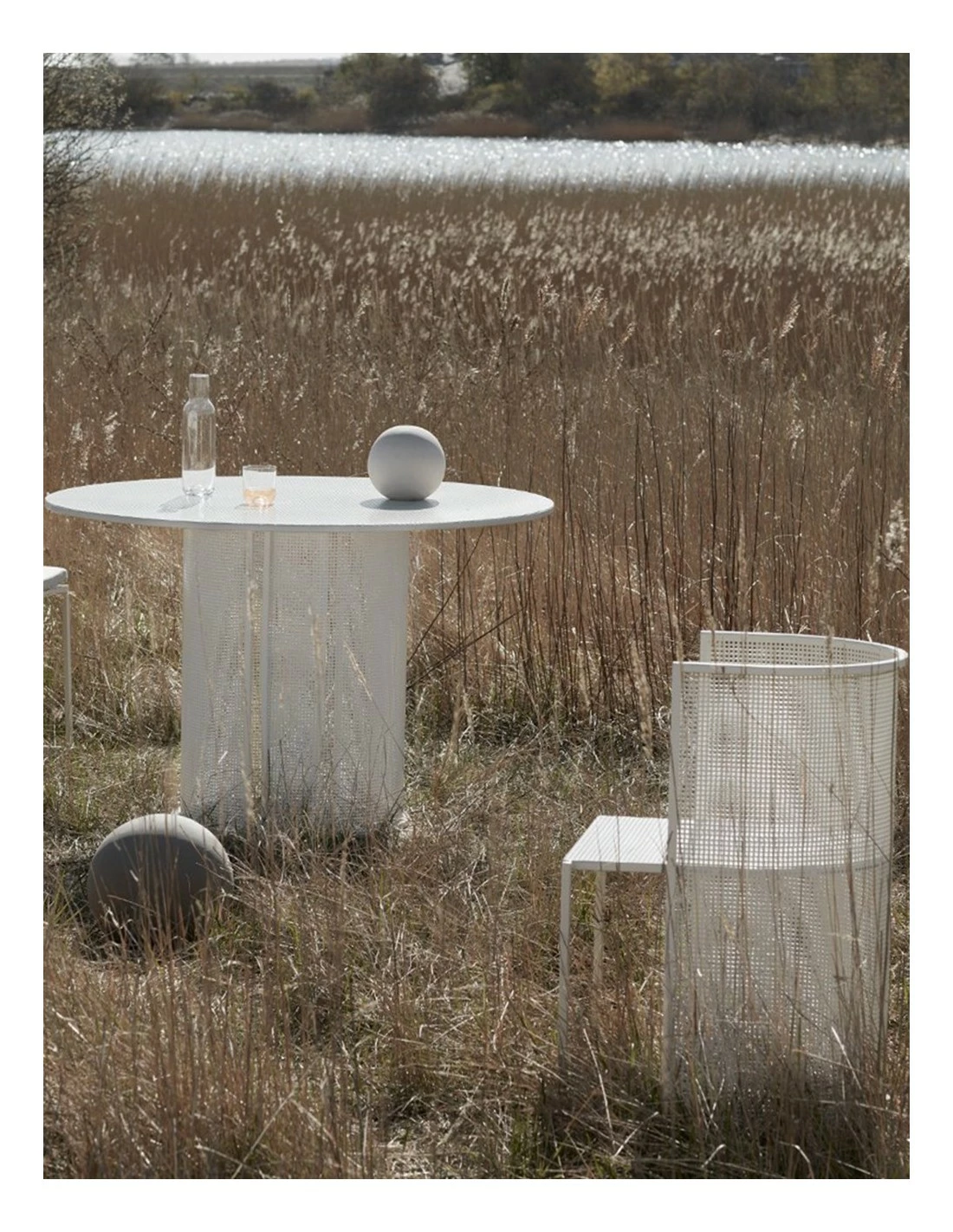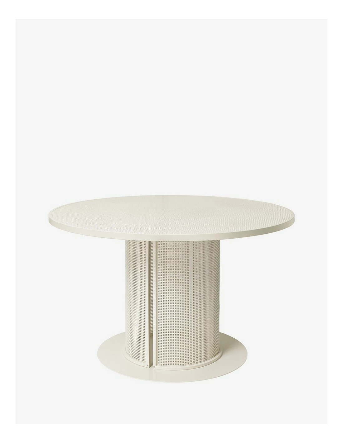 Mesa de estilo minimalista realizada en acero perforado apta para su uso en exterior.