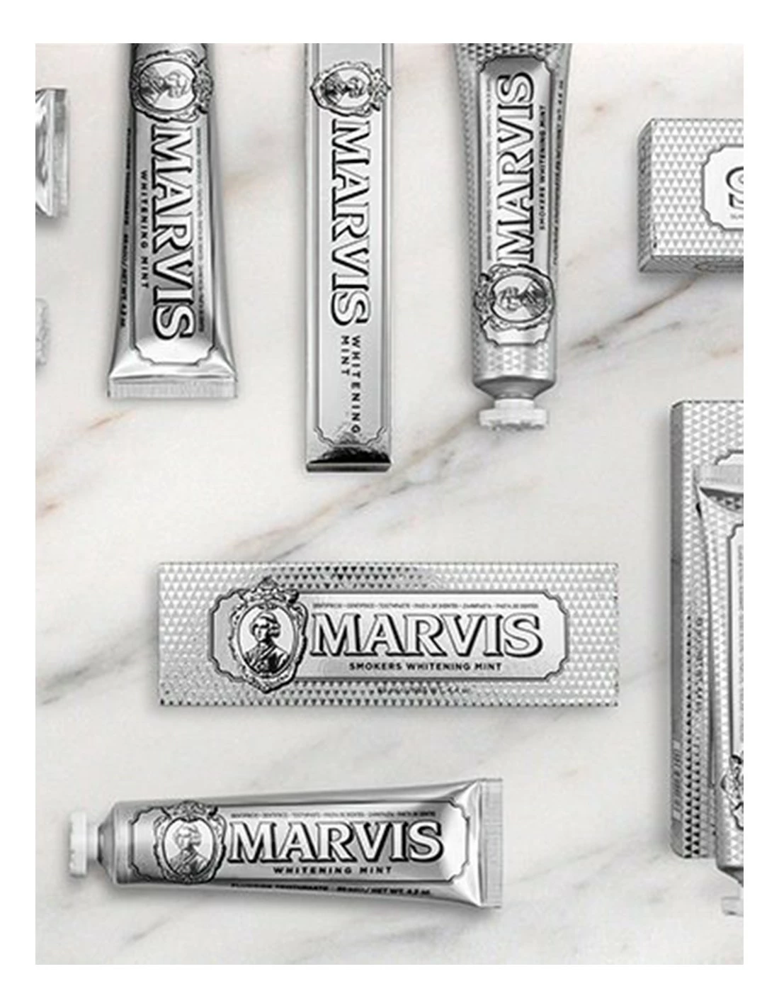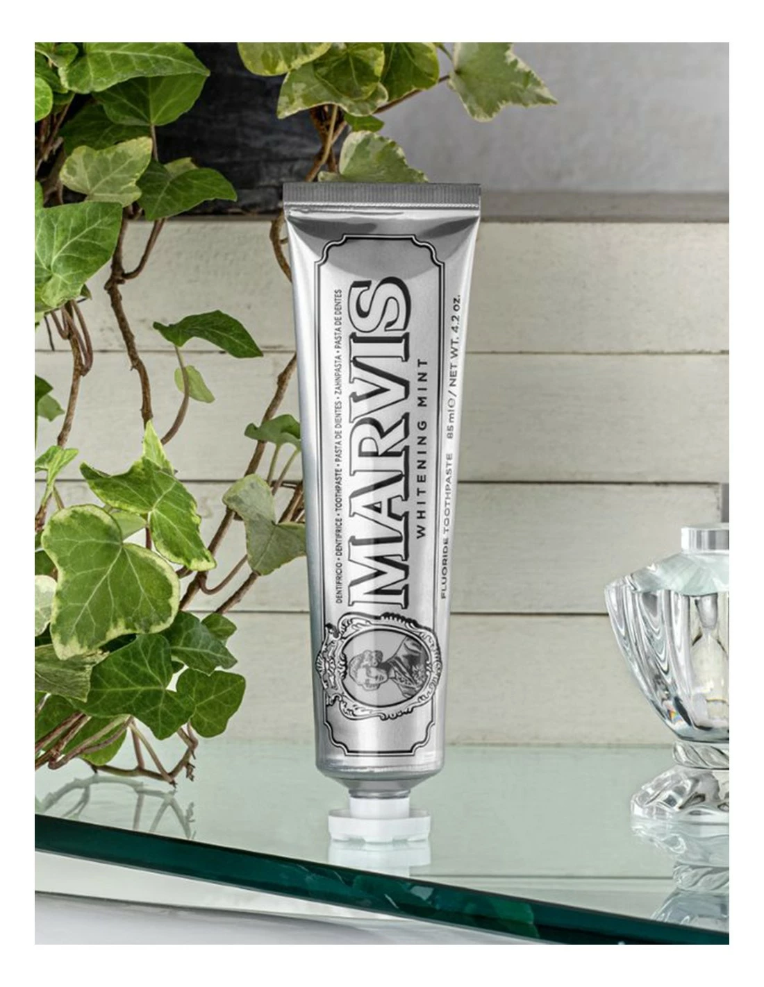 Marvis Whitining Mint con sabor mentolado te ofrece una sensación intensa de sabor eliminando la placa para un sonrisa blanca y brillante.