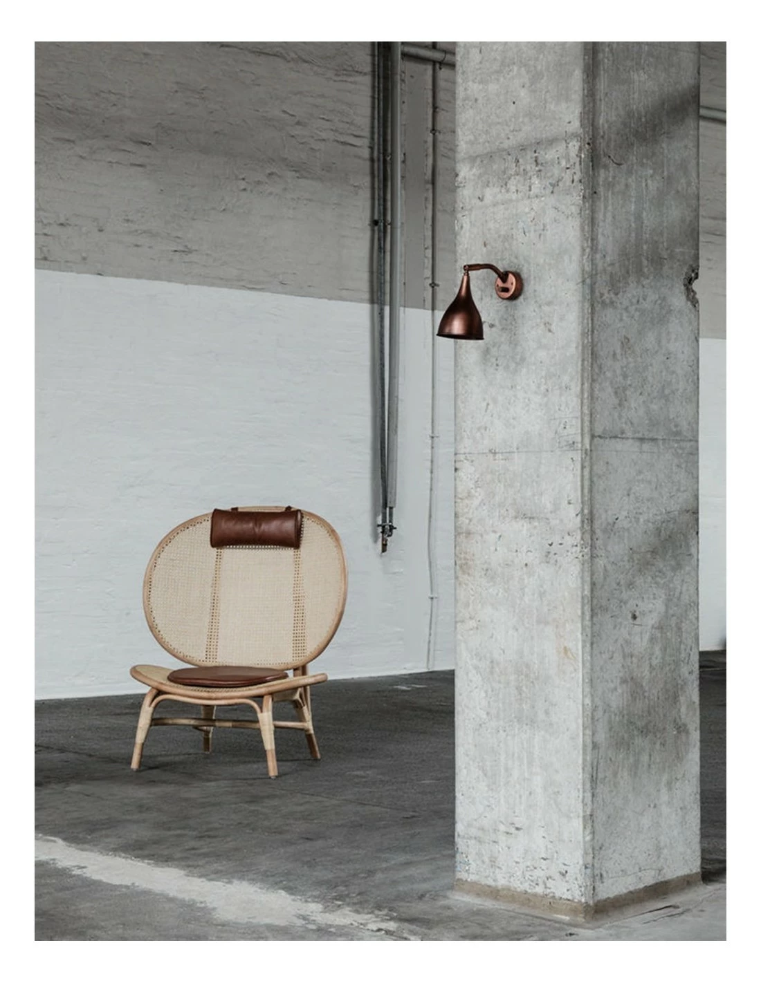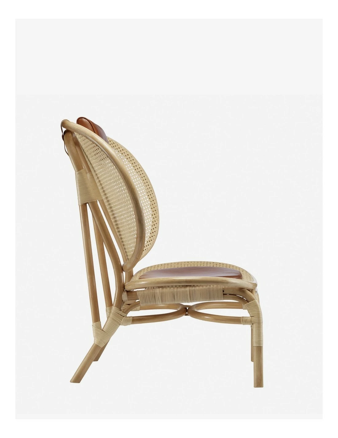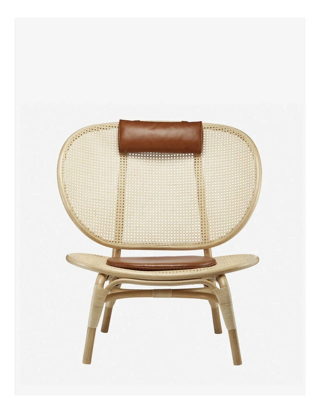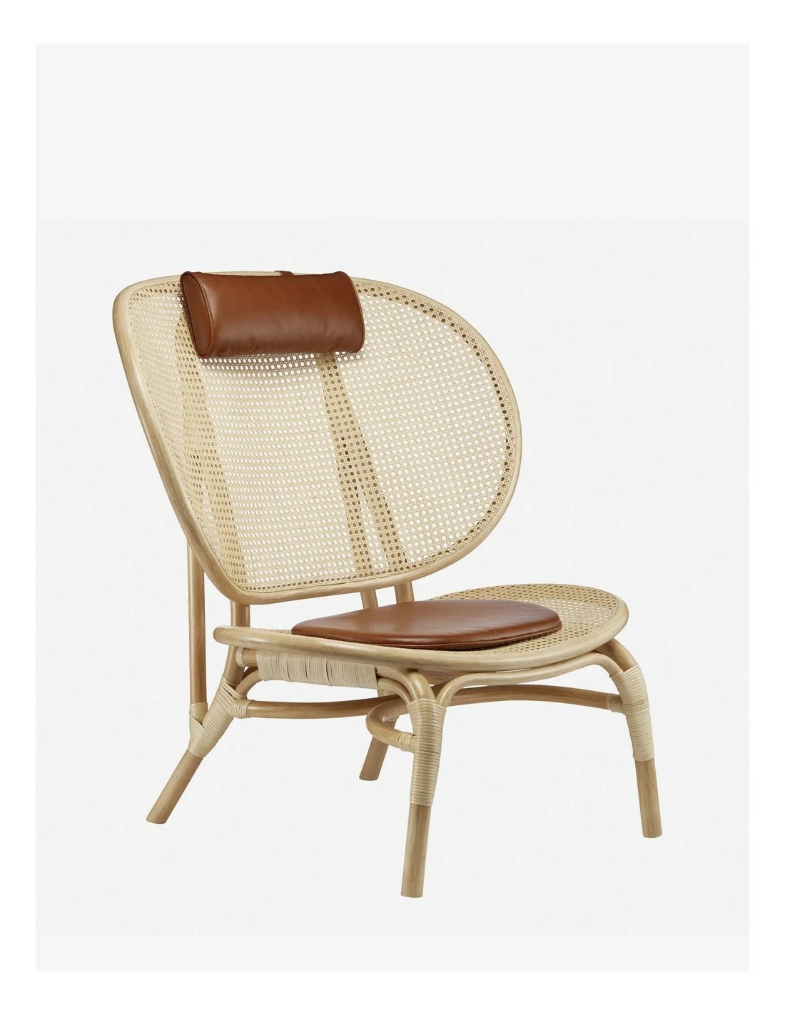 Silla de ratán de estilo nórdico con cojín y reposacabezas en piel anilina de Norr11.